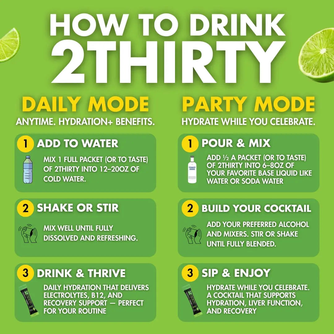 2THIRTY is formulated with ingredients like Vitamin B12, Vitamin C, Pink Himalayan Sea Salt, Black Pepper Extract, L-Ornithine, L-Glutathione, L-Theanine, NAC, Milk Thistle, and Ginseng Root. This blend works synergistically to replenish nutrients, support liver function, and boost energy levels, helping you recover from a hangover faster and more effectively than products that only contain electrolytes.