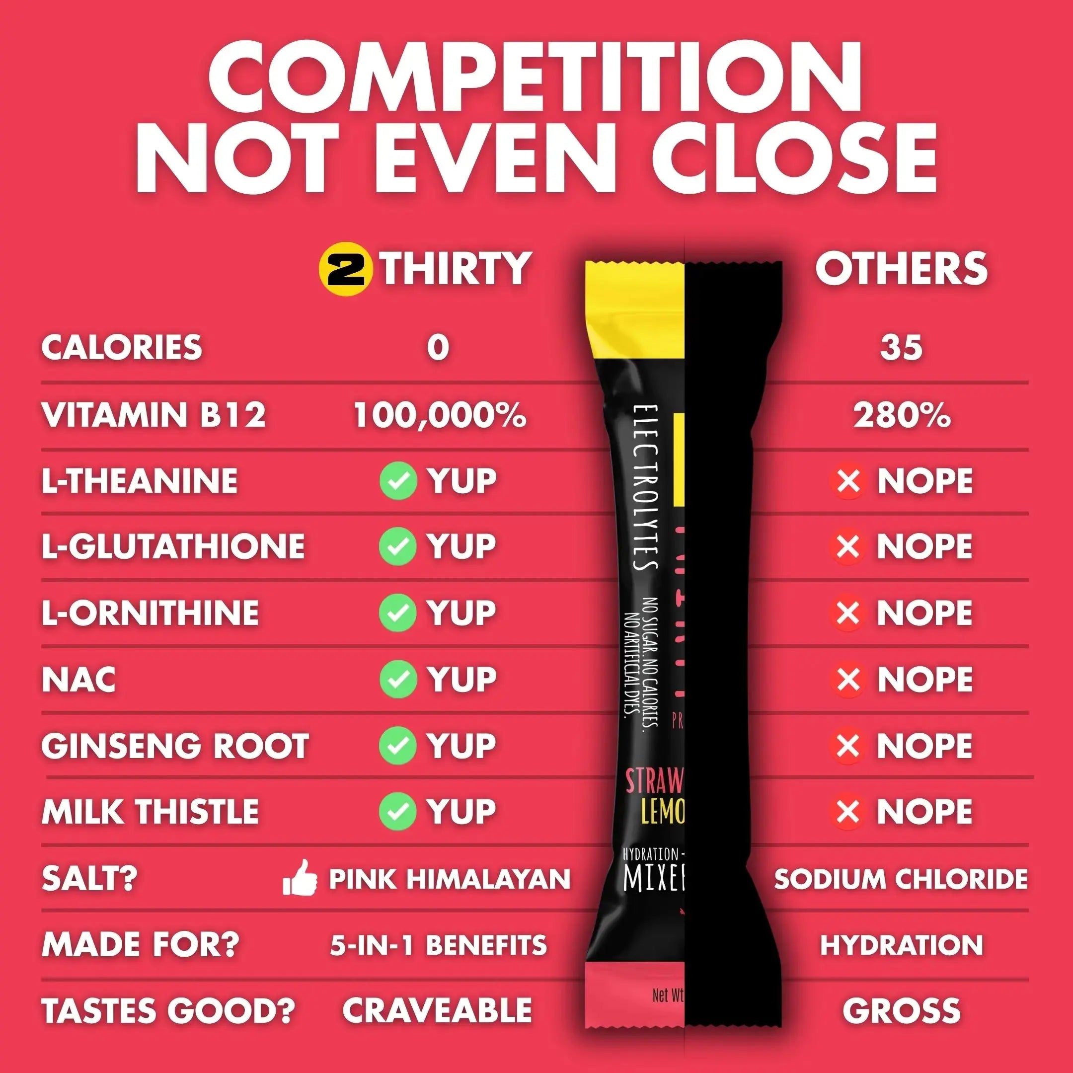Unlike other hang*ver remedies that focus solely on electrolytes, 2THIRTY provides a comprehensive blend of vitamins, minerals, and natural extracts that address the full spectrum of hang*ver symptoms. This makes 2THIRTY a superior choice for those seeking a complete recovery solution. Oh! and its designed to take before you even have a hang*ver!